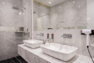 Совмещенный санузел с тропическим душем также предусмотрены средства личной гигиены, полотенца, мыло, шампунь и гель для душа.