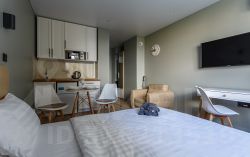 УДОБСТВА В АПАРТАМЕНТАХ: кондиционер, wi-fi (100мб/сек), цифровое ТВ (130 каналов), плазменный ТВ, СВЧ, чайник, вся необходимая посуда для приготовления и приёма пищи, качественные постельное белье и полотенца, стиральная машина, утюг, гладильная доска, фен и прочие бытовые мелочи (одноразовые тапочки и индивидуальный косметический набор)