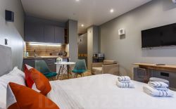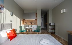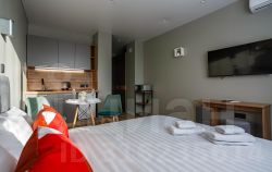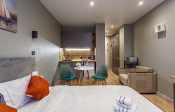 УДОБСТВА В АПАРТАМЕНТАХ: кондиционер, wi-fi (100мб/сек), цифровое ТВ (130 каналов), плазменный ТВ, СВЧ, чайник, вся необходимая посуда для приготовления и приёма пищи, качественные постельное белье и полотенца, стиральная машина, утюг, гладильная доска, фен и прочие бытовые мелочи (одноразовые тапочки и индивидуальный косметический набор)