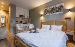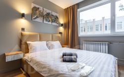 ОПИСАНИЕ: апартаменты с новым дизайнерским евро-ремонтом со всей необходимой мебелью. Размещение до 3-ёх человек. Спальные места: двуспальная кровать (160 на 200) + кресло-кровать, встроенная кухня, с/у в кафеле, импортная сантехника, стеклопакеты.