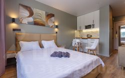 УДОБСТВА В АПАРТАМЕНТАХ: кондиционер, wi-fi (100мб/сек), цифровое ТВ (130 каналов), плазменный ТВ, СВЧ, чайник, вся необходимая посуда для приготовления и приёма пищи, качественные постельное белье и полотенца, стиральная машина, утюг, гладильная доска, фен и прочие бытовые мелочи (одноразовые тапочки и индивидуальный косметический набор)