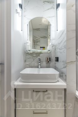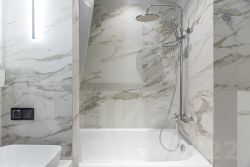 — Стильная ванная с мраморными элементами и тропическим душем.