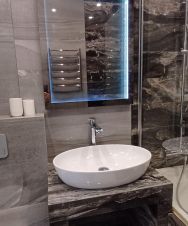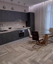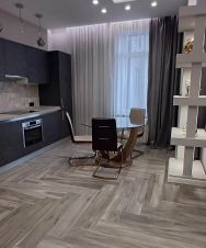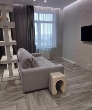 Квартира оформлена в дизайнерском стиле и полностью готова для комфортного проживания. В квартире есть вся необходимая мебель как на кухне, так и в комнате. Кухня площадью 13 кв. м оборудована современной техникой: холодильник, посудомоечная машина, кондиционер, и стиральная машина. В ванной комнате установлено: раковина,зеркало, ванна и унитаз.