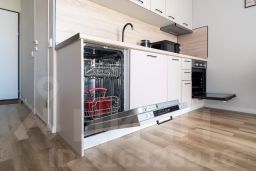 В кухонной зоне установлена варочная панель, чайник, микроволновка, духовой шкаф, фильтр для воды, посудомоечная машина, холодильник, а также имеется необходимая для приготовления и приёма пищи посуда.