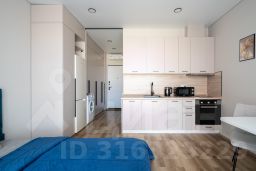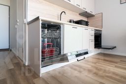 В кухонной зоне установлена варочная панель, чайник, микроволновка, духовой шкаф, фильтр для воды, посудомоечная машина, холодильник, а также имеется необходимая для приготовления и приёма пищи посуда.