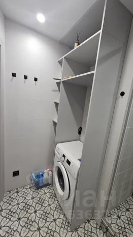 Ванная комната: стиральная машина, зеркало с подсветкой, душевая со стеклянной шторой.