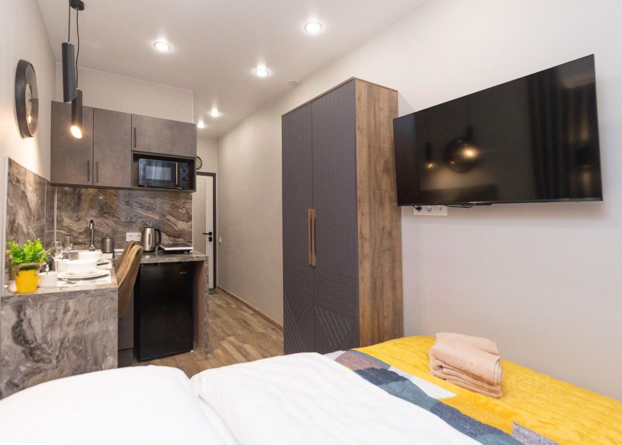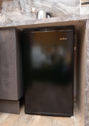 - Кухня с холодильником, плитой, микроволновкой, чайником и посудой