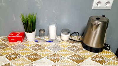В студии есть всё необходимое для комфортного проживания. Приятные мелочи жизни: чай, сахар, зубная паста, гель для душа, жидкое мыло. Всегда чистое постельное бельё и полотенца, посуда, чайник, микроволновка, электроплита, бытовая химия, стиральная машина-автомат, утюг, 2 - местный диван, сушилка для белья, гладильная доска.