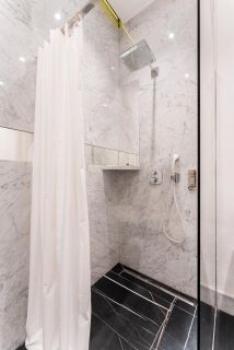 Совмещенный санузел с тропическим душем также предусмотрены средства личной гигиены, полотенца, мыло, шампунь и гель для душа.