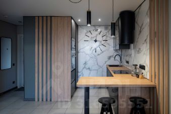 - Дизайнерская мебель: двухспальная кровать с ортопедическим матрасом, 2 тумбы, трехстворчатый шкаф, подвесные консоли под ТВ, кухонный гарнитур под заказ с пеналами и барной стойкой, стулья, диван-кровать Moon, журнальные столики, встроенный шкаф в прихожей, встроенная мебель в С/У, многоуровневое освещение и др.