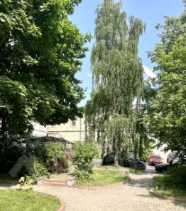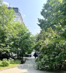 Вид в тихий зеленый двор. Охраняемая огороженная территория.