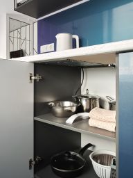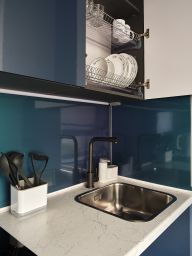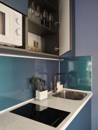 * Современная кухня, оборудованная необходимым - варочная панель, холодильник, СВЧ печь, чайник, посуда для приготовления и приема пищи.