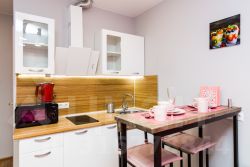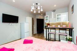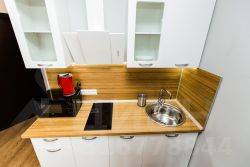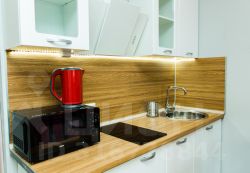 - Кухня с холодильником, плитой, микроволновкой, чайником и посудой