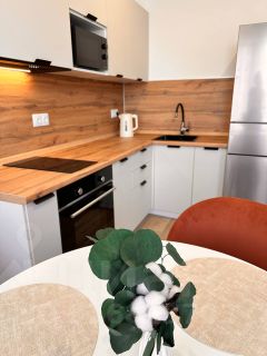 В кухне гостинной находится кухонный гарнитур с обеденной зоной, вся необходимая техника и посуда для приготовления и приёма пищи, микроволновая печь, диван евро книжка, письменный стол, большой телевизор с WI-FI.