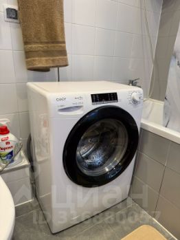 Стильная ванная комната с полотенцесушителем и новой стиральной машиной.