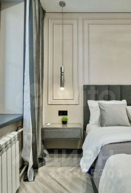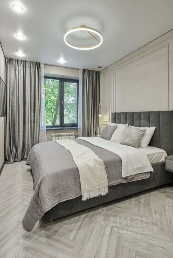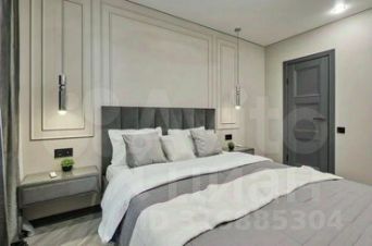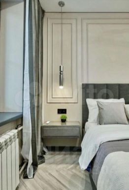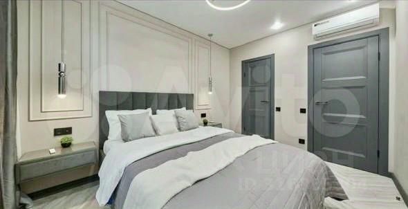 Спальня: пол наборная доска, стены покрашены, освещение точечные светильники, люстра, подвесные светильники. Сплит система, большая двуспальная кровать с подъемным механизмом, подвесные тумбы. в спальне так же расположен вместительный гардероб.