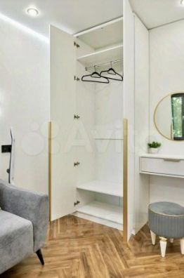 Гостинная: пол наборная доска, стены декоративная штукатурка, большой телевизор с wi fi, Сплит система, большой удобный раскладной диван, шкаф, будуарный столик с зеркалом, пуф. освещение точечное, люстра и бра.