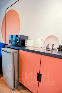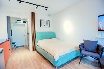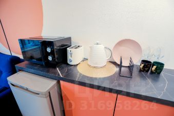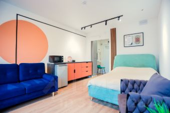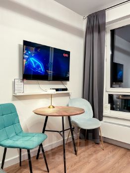 Небольшая уютная квартира-студия с современным ремонтом и на высоком этаже - со всем необходимым для комфортного проживания: Кровать 140см, раскладной диван, кухонный уголок с индукционной плитой, чайником, микроволновкой и холодильником, а так же стиральная машина, телевизор Смарт и фен с утюгом.
