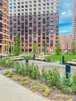 Возле дома общественные пространства - детские площадки, фонтаны, и пешеходный бульвар. На первых этажах домов в квартале - различные сетевые магазины, кофейни, пекарни. Работает доставка продуктов и готовой еды Купер.
