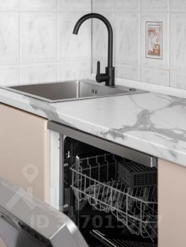 Кухня полностью оснащена современной бытовой техникой: посудомоечная машина, холодильник, плита — всё для самостоятельного приготовления блюд.