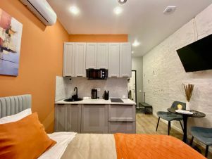 Уютная студия с дизайнерским ремонтом, полностью оборудованной кухней и всем необходимым для идеального отдыха или работы. Бесконтактное заселение 24/7 — заезжайте в любое время!