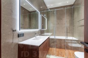 Выполнена отделка в современном лаконичном стиле из новых коллекций лучших европейских производителей. Кухня оборудована встроенной бытовой техникой, ванные комнаты - сантехникой. Предусмотрено большое количество встроенных шкафов для хранения.