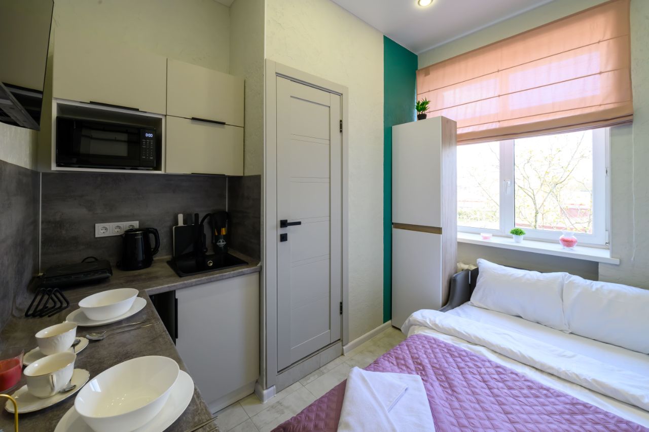 - Кухня с холодильником, плитой, микроволновкой, чайником и посудой