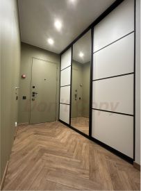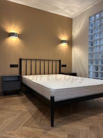 - В спальне: зеркальный шкаф Oscar, двуспальная кровать 140*200 с матрацем Mildex, прикроватные тумбочки и встроенный большой стол из керамогранита