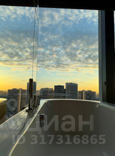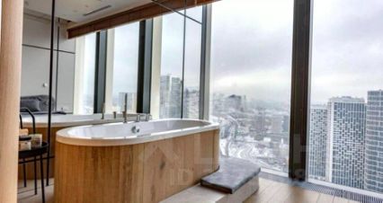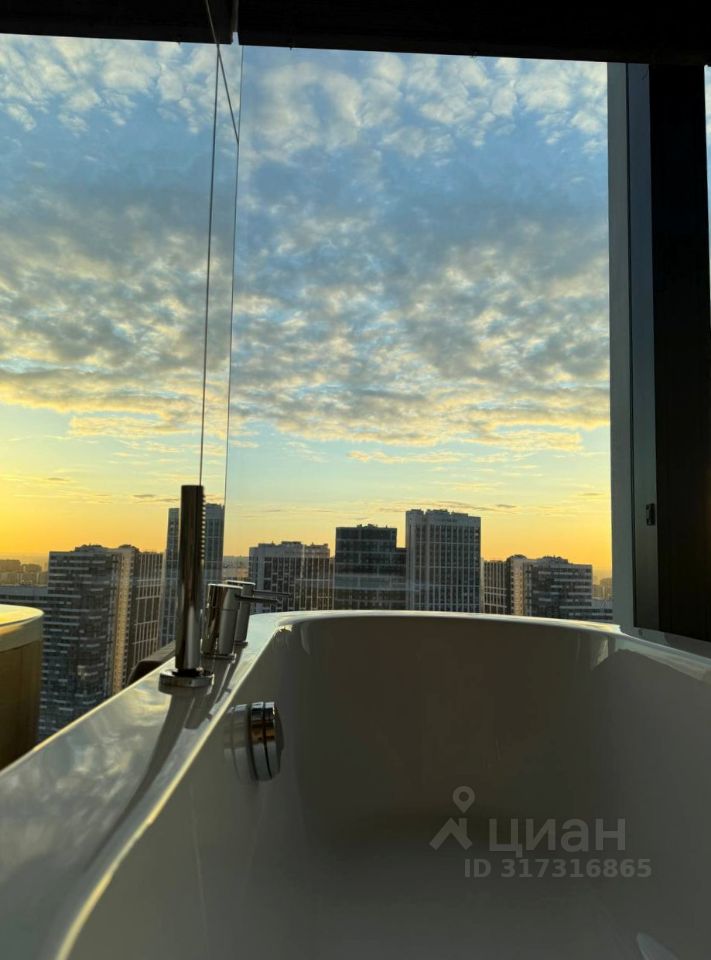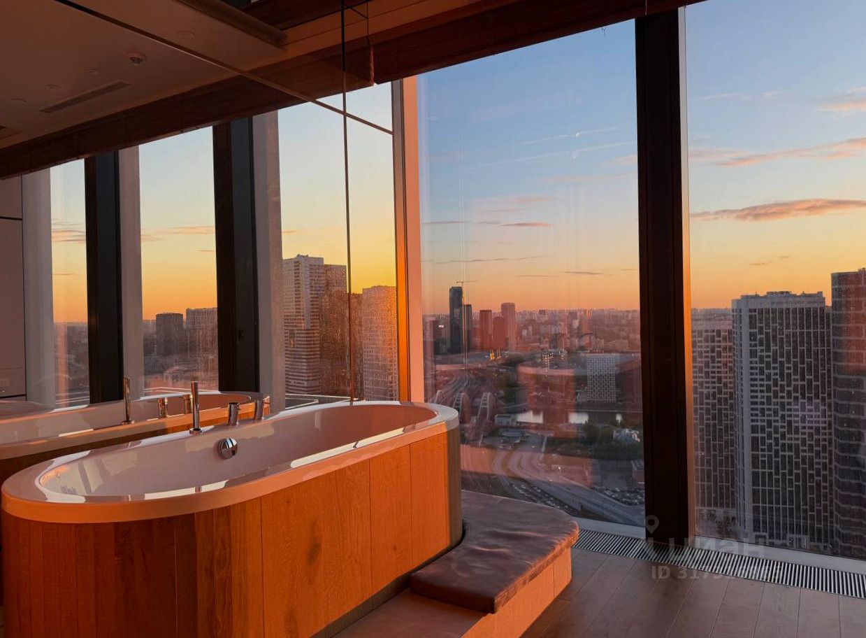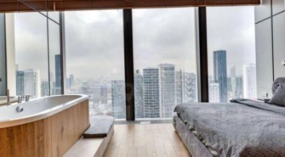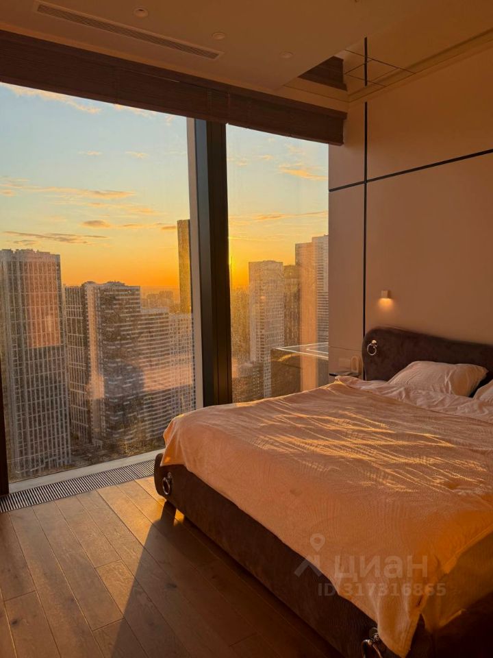 огромное панорамное остекление возле кровати открывает самые безумные виды на Москву.