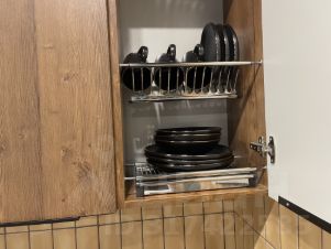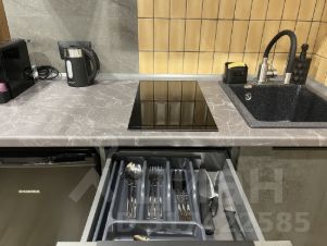 Оборудованная кухня с индукционной плитой, раковиной со смесителем и дозатором, посуда, все для приготовления и употребления еды и напитков.