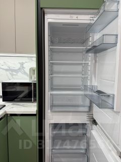Кухня с чайником, фильтром для воды, электрической плитой, кастрюлей, сковородкой, столовыми приборами, кружками, бокалами для вина, стаканами, ножами, холодильником с морозилкой, микроволновкой, столом для обеда, стульями