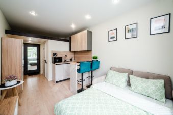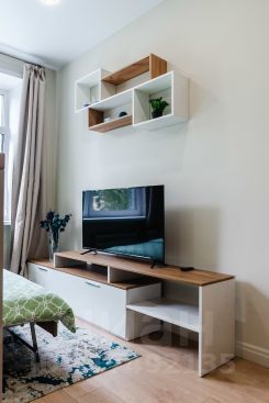 Современная мебель, двуспальная кровать, бытовая техника, скоростной WI-FI, спутниковое TV, гладильная доска, сушка, оборудованная кухня, полный комплект посуды для приготовления и приёма еды, тапочки и фен