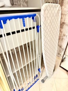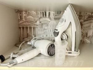 Бытовая техника: холодильник, плита, фен, СВЧ, стиральная машина, сушилка для белья, утюг, чайник.