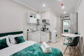 Современная мебель, двуспальная кровать, бытовая техника, спутниковое TV, гладильная доска, сушка, оборудованная кухня, полный комплект посуды для приготовления и приёма еды, фен