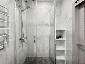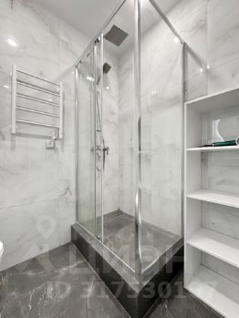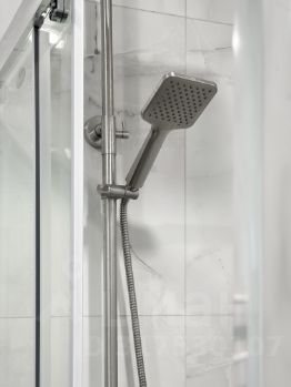 -Ванная комната с душевой кабиной и средствами личной гигиены.