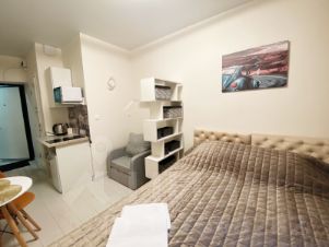 Современная мебель, двуспальная кровать, бытовая техника, скоростной WI-FI, спутниковое ТV, гладильная доска, сушилка для белья, фен, оборудованная кухня, полный комплект посуды для приготовления и приёма еды