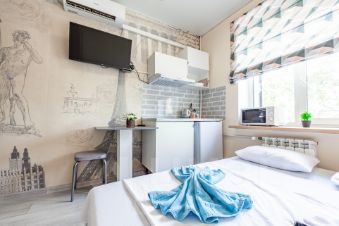 Современная мебель, двуспальная кровать, бытовая техника, скоростной WI-FI, спутниковое TV, гладильная доска, сушка, оборудованная кухня, полный комплект посуды для приготовления и приёма еды, тапочки и фен