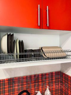 холодильник, кухонная плита, СВЧ, духовой шкаф, посуда, электрочайник, тостер