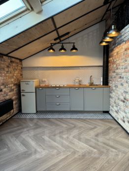 Апартаменты состоят из совмещенной кухни-гостинной и ванной комнаты на первом этаже + спальня на втором этаже. Все обставлено мебелью, есть места для хранения. Кухня укомплектована бытовой техникой (посудомоечная машина, фильтр для питьевой воды, микроволновая печь, холодильник) - все в едином стиле. В ванной комнате - душевая кабина, стиральная машина. На первом этаже зона отдыха - диван и новый современный ТВ + рабочая зона (полноценный раритетный рабочий стол с раскладными дополнительными столешницами и ящиками). Установлена новая система отопления, а также настоящий дровяной камин!