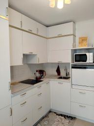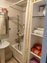 В квартире есть все необходимое для комфортного проживания гостей: раскладной диван, кушетка,полностью оборудованная кухня: холодильник, чайник, микроволновая печь, посуда, чай, гладильная доска, утюг, санузел с ванной, фен, стиральная машина.
