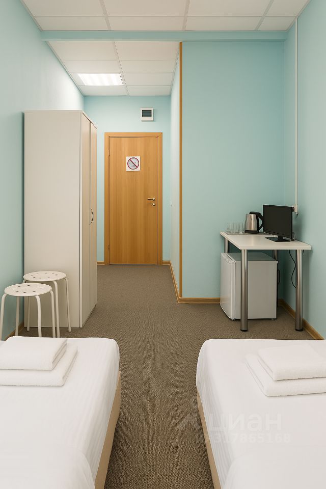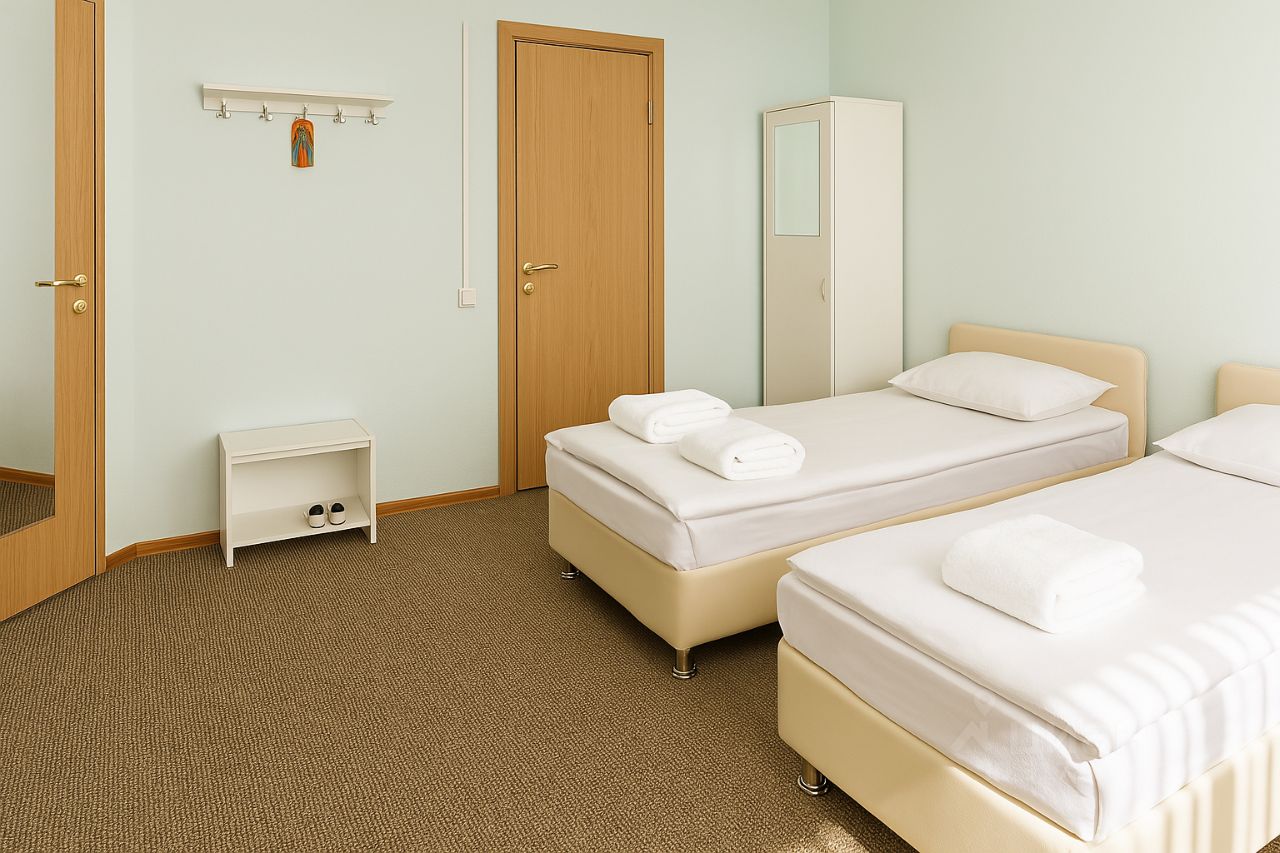 Отдельный номер площадью от 9,4 м2 до 14,0 м2. В номере: две односпальные кровати 90*200, стол, стулья, шкаф с вешалками для одежды, телевизор, холодильник (не во всех номерах), чайник, чайный набор. Санузел с душем, фен, туалетные принадлежности (шампунь и гель для душа, туалетная бумага, освежитель воздуха)