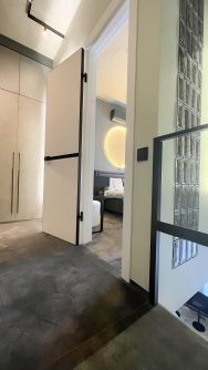 Установлена система умный дом. Можно управлять с помощью голосовых команд светом , техникой, а также дистанционно со смартфона следить за температурой и влажностью в доме, запускать влажную уборку с помощью робота-пылесоса. Шторы блэкаут на электроприводах. Окна деревянные в пол, с датчиками открывания. Дверь с умным замком и видеоглазком. Открывать можно с помощью отпечатка пальца и кода.