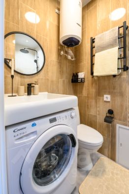 Ванная комната: cтиральная машина и фен для вашего комфорта.