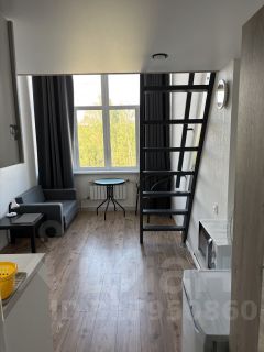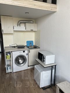 Студия 18 метров (по полу) + небольшая антресоль (высота 1,4 м.) для спального места или хранения. Долгосрочная аренда. В наличии кухня, стулья, холодильник, шкаф, микроволновая, стиральная машина, диван.