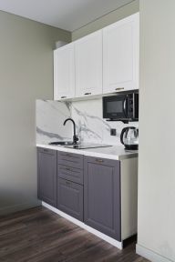 - Кухня с холодильником, плитой, микроволновкой, чайником и посудой