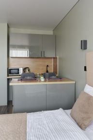 - Кухня с холодильником, плитой, микроволновкой, чайником и посудой