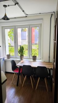 Квартира расположена на первом этаже и смотрит окнами во внутренний закрытый двор с обильной зеленью, что обеспечивает тишину, комфорт и приватность. Окна обращены на восток, утром квартира наполнена солнечным светом, а днём защищена от жары, что особенно комфортно летом.
