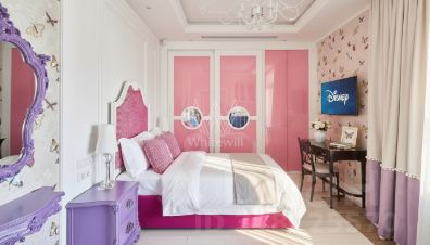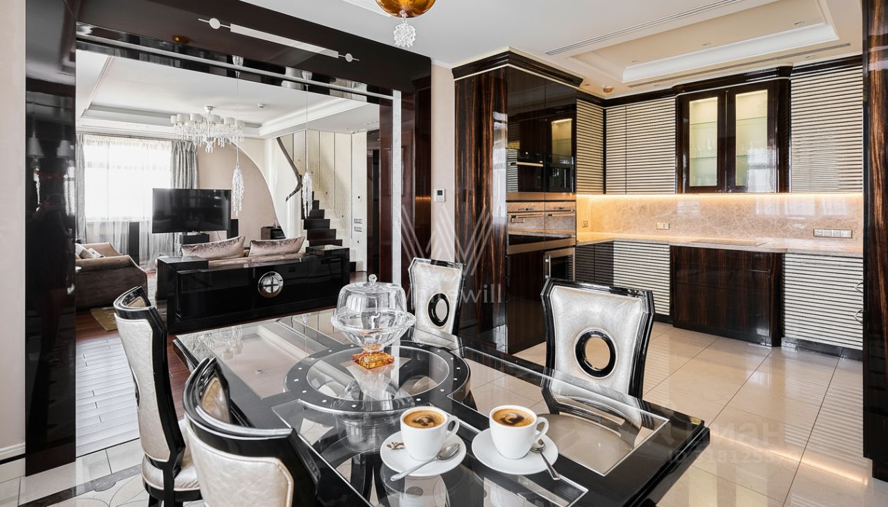 1-й этаж: гостиная, кухня-столовая, спальня с гардеробной, детская спальня, гостевой санузел с бойлером, стиральной и сушильной машиной. 2-й этаж: мастер-спальня с большой гардеробной, своим санузлом с ванной и душем, кабинет. Всего в квартире 3 санузла, включая душ, ванную и биде. Установлена система кондиционирования, приточно-вытяжная вентиляция. Вдоль всей квартиры спланирована просторная лоджия. Дополнительно в наличии 3 машиноместа.