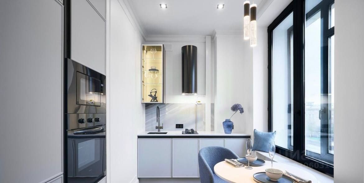 • Просторная кухня с немецкой техникой Weissgauff: посудомоечная машина, духовой шкаф, варочная поверхность, вытяжка, холодильник и микроволновка с грилем.