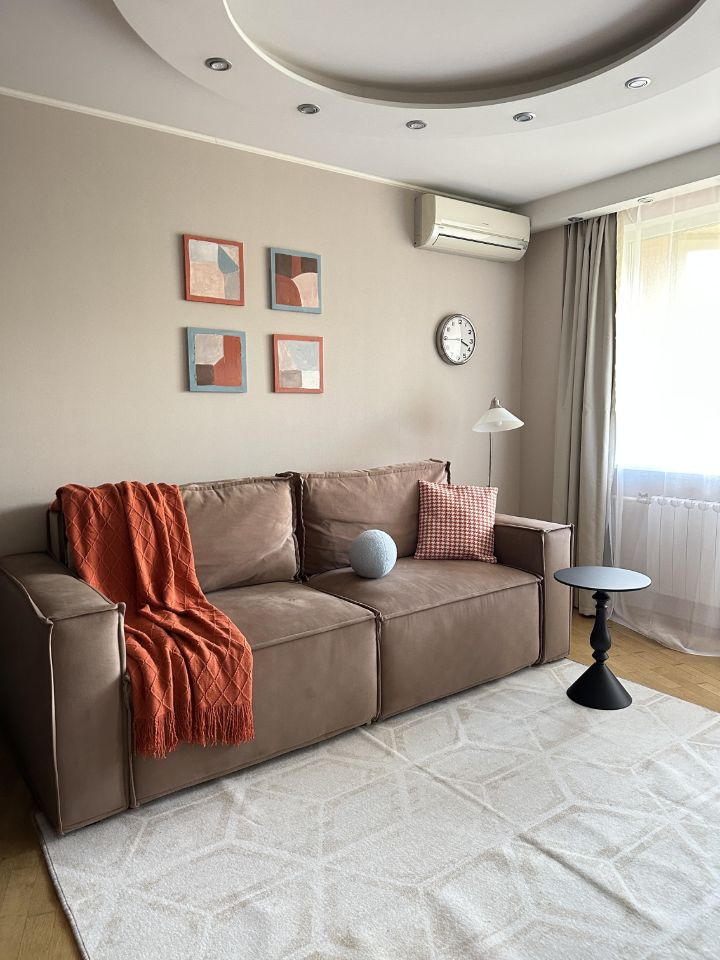 В квартире есть 1 широкая кровать, большой диван для двоих взрослых или троих детей. Рабочее место в спальной.